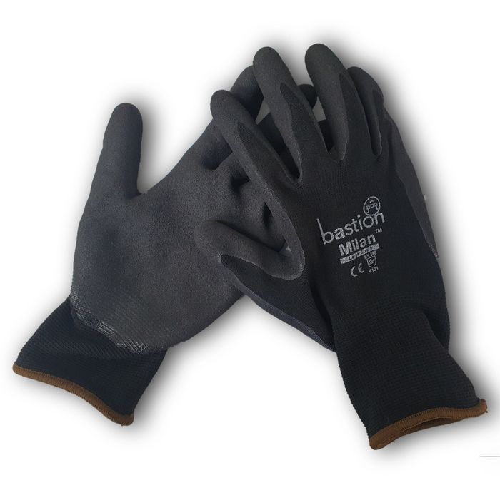 - 13G seamless breathable nylon shell. - Double dipped nitrile coating for superior oil and water resistance. - Excellent dexterity and abrasion resistance. - Sandy foam nitrile second coat provides exceptional grip in dry, wet and oily conditions. - Elastic knitted cuffs for comfortable secure fit.