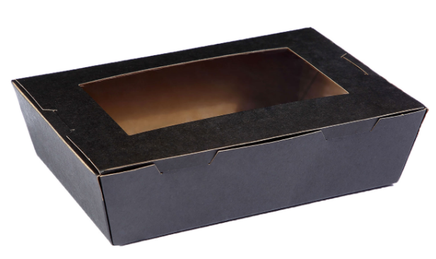 - Made from poly-lined (PE) black paper-board. - Suitable for hot and cold Contents. - Suitable for high Grease Contents. - Side tabs secure the lid in place. - Suitable for refrigeration. - No added PFAS.