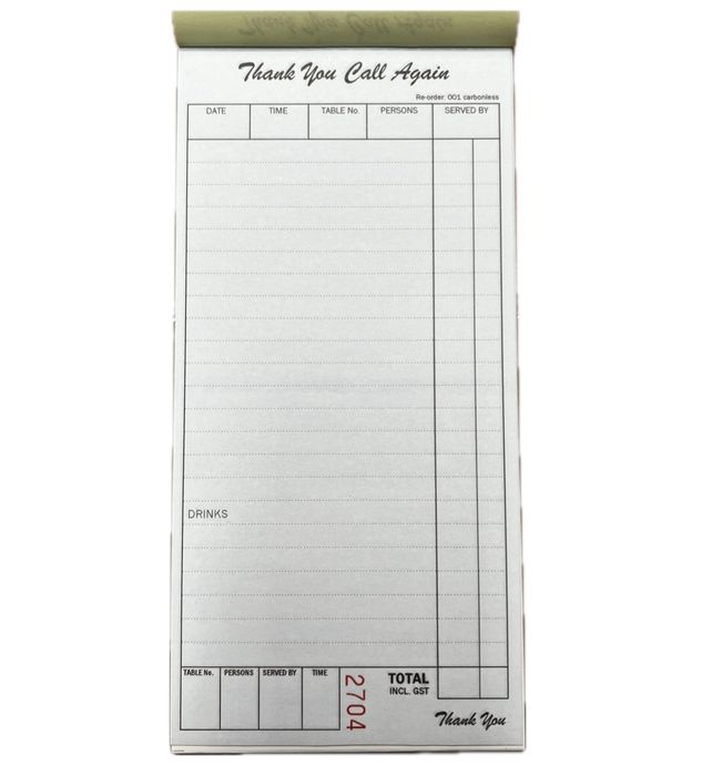 - Made from virgin paper. - Not recyclable. - Desinged to streamline order-taking. - Quad paper for multiple copies. - Large writing for better visual.
