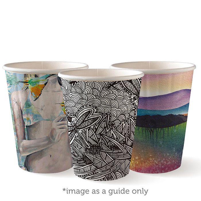 Art Series designs and aim to promote the arts community. They are made with paper sourced from managed plantations and lined with Ingeo™ – a bioplastic made from plants, not oil. BioCups are made from premium paper board and offer superior stability, lid fit, and insulation.