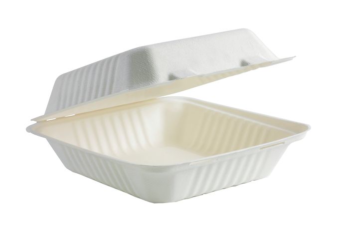 BioPaks' sugarcane clamshells are tree-free – made from reclaimed and rapidly renewable sugarcane pulp. Certified home compostable and may be accepted in kerbside recycling, if not too soiled by food (like pizza boxes). Suitable for many meal types.